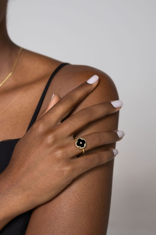 Com design moderno e acabamento elegante, o Anel Ajustável Trevo Preto apresenta detalhe central em formato de trevo com aplicação na tonalidade preta, criando um contraste sofisticado e marcante. O visual equilibrado entre o dourado e o preto traz personalidade à peça, tornando-a versátil para diferentes estilos.