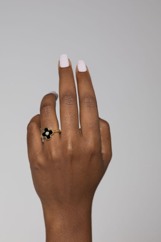 Este Anel Ajustável Trevo Preto com Zircônia é banhado em 10 camadas de Ouro 18K, garantindo a você muita qualidade e durabilidade, evitando que a peça escureça, desbote ou descasque.