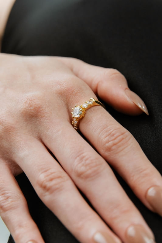Acessório com brilho e elegância, o Anel Cravejado com Ponto de Luz combina zircônias cravejadas ao longo da estrutura com um ponto de luz central em destaque, criando um efeito luminoso contínuo e sofisticado. O conjunto de pedras foi distribuído de forma harmoniosa, resultando em um visual moderno e refinado, sem excesso de informação visual.