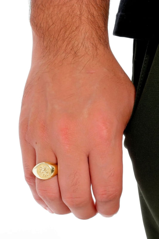 Este Anel de São Jorge é banhado em 10 camadas de Ouro 18k, garantindo a você muita qualidade e durabilidade, evitando que a peça escureça, desbote ou descasque.