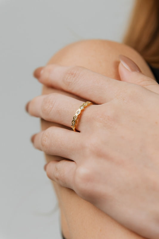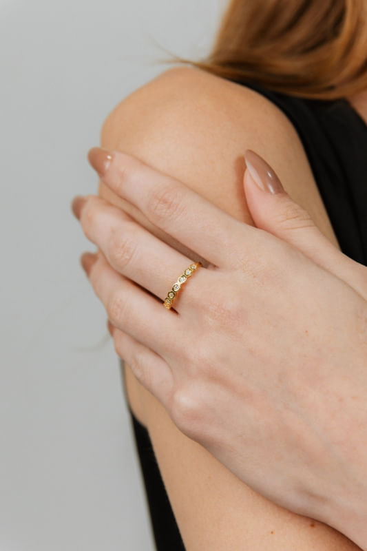 Com design minimalista e luminoso, o Anel Pontos de Luz apresenta pequenos destaques de brilho que criam um efeito sutil e sofisticado. A distribuição dos pontos de luz torna o visual delicado, mas com presença elegante, ideal para quem busca um acessório discreto que adiciona brilho refinado a qualquer composição.
