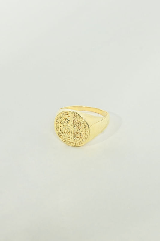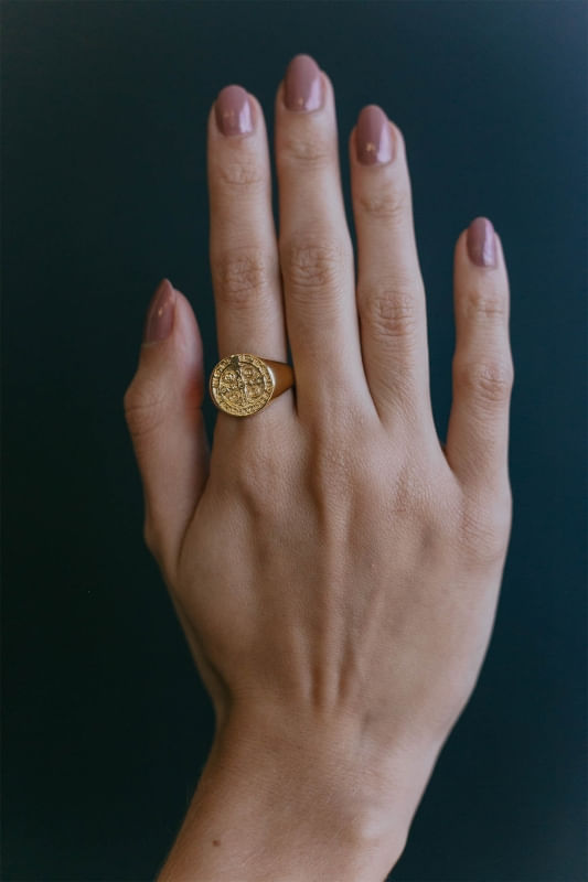 Com um design marcante e cheio de significado, o Anel São Bento traz o tradicional símbolo de proteção representado pela medalha de São Bento, conhecido por seu valor espiritual e simbólico. O detalhe central destaca o desenho clássico da medalha, criando uma peça elegante que une fé e estilo em um único acessório.