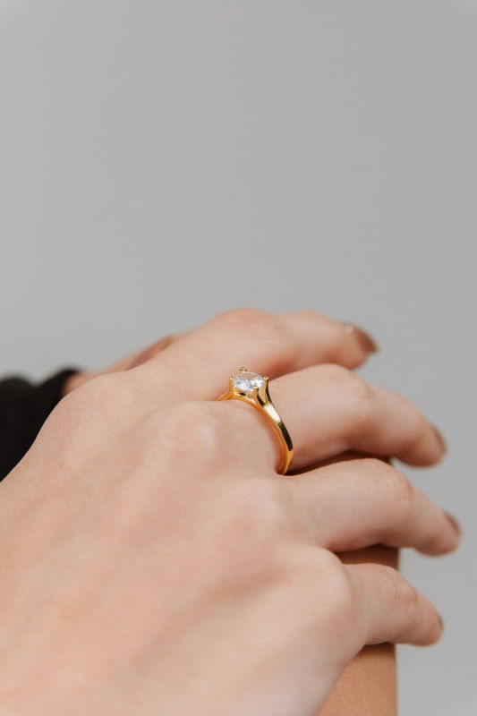 ajuda a realçar o brilho da pedra sem sobrecarregar o visual. O design permite que o anel seja utilizado tanto sozinho quanto em combinações com outros acessórios, mantendo sempre harmonia estética.