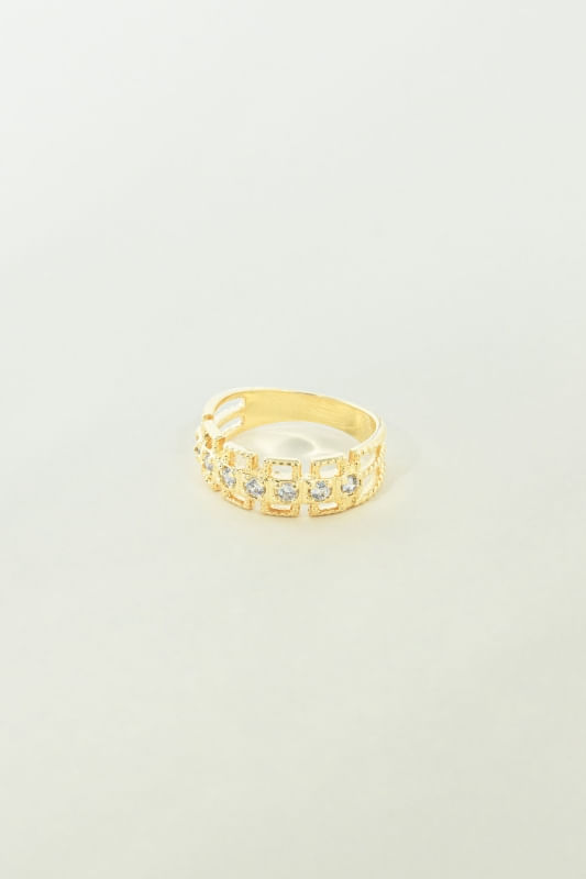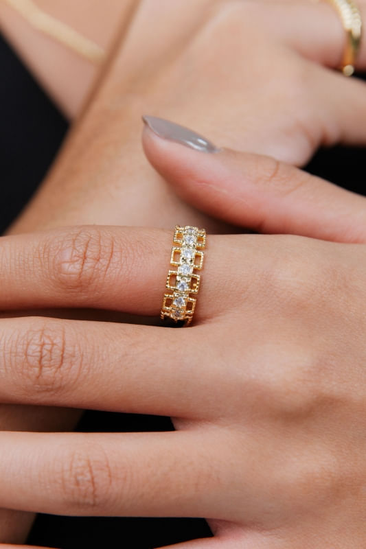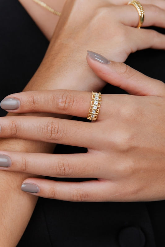 Banhado em 10 camadas de Ouro 18K, o anel oferece excelente durabilidade e resistência, preservando o brilho e a qualidade da peça ao longo do tempo. Além disso, conta com proteção antialérgica, garantindo conforto durante o uso