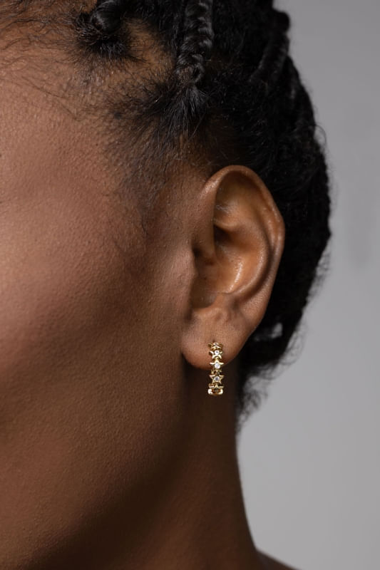Elegante e marcante, o brinco possui tamanho de 1,7 cm, com design que valoriza o rosto e adiciona um toque de brilho sutil ao visual. Os detalhes em estrelas com pontos de luz tornam a peça versátil, podendo ser usada sozinha como destaque ou combinada com outros acessórios para composições mais elaboradas.