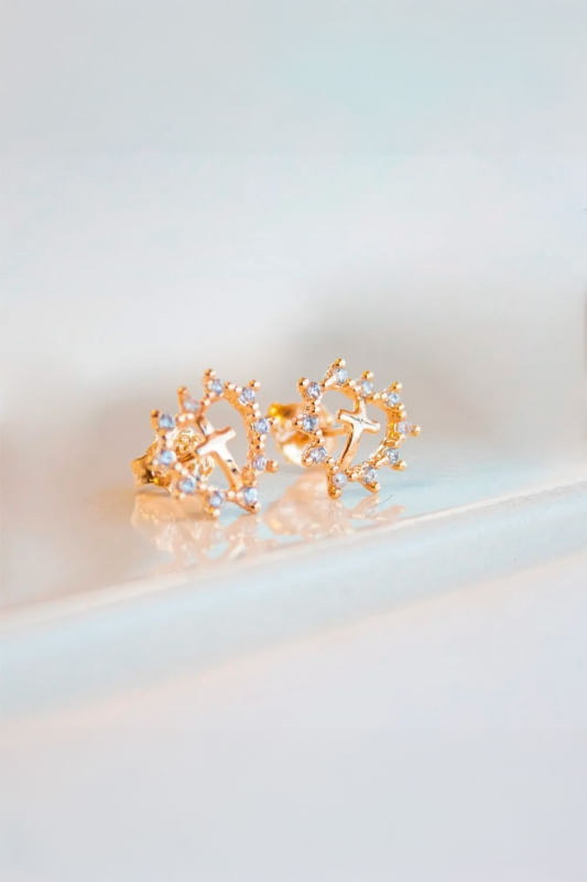 Brinco Coração Vazado Cravejado Laterais e Cruz Lisa