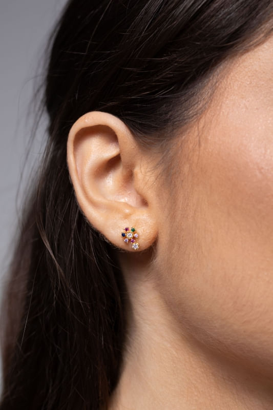 Delicado e cheio de charme, o Brinco Cravejado Colorido apresenta um design cravejado com pequenas zircônias coloridas que criam um brilho sutil e sofisticado. A peça valoriza cada detalhe, trazendo leveza e elegância ao visual.