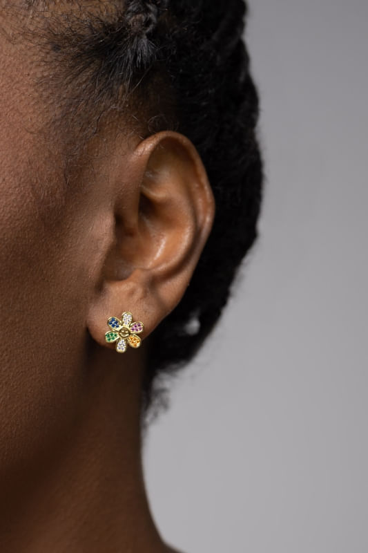 Charmoso e cheio de vida, o Brinco Flor Cravejada Colorida apresenta um design delicado inspirado nas formas das flores, com pedras coloridas cuidadosamente cravejadas que realçam o brilho e destacam o formato da peça. A combinação das cores cria um efeito alegre e sofisticado, trazendo leveza e personalidade ao acessório.