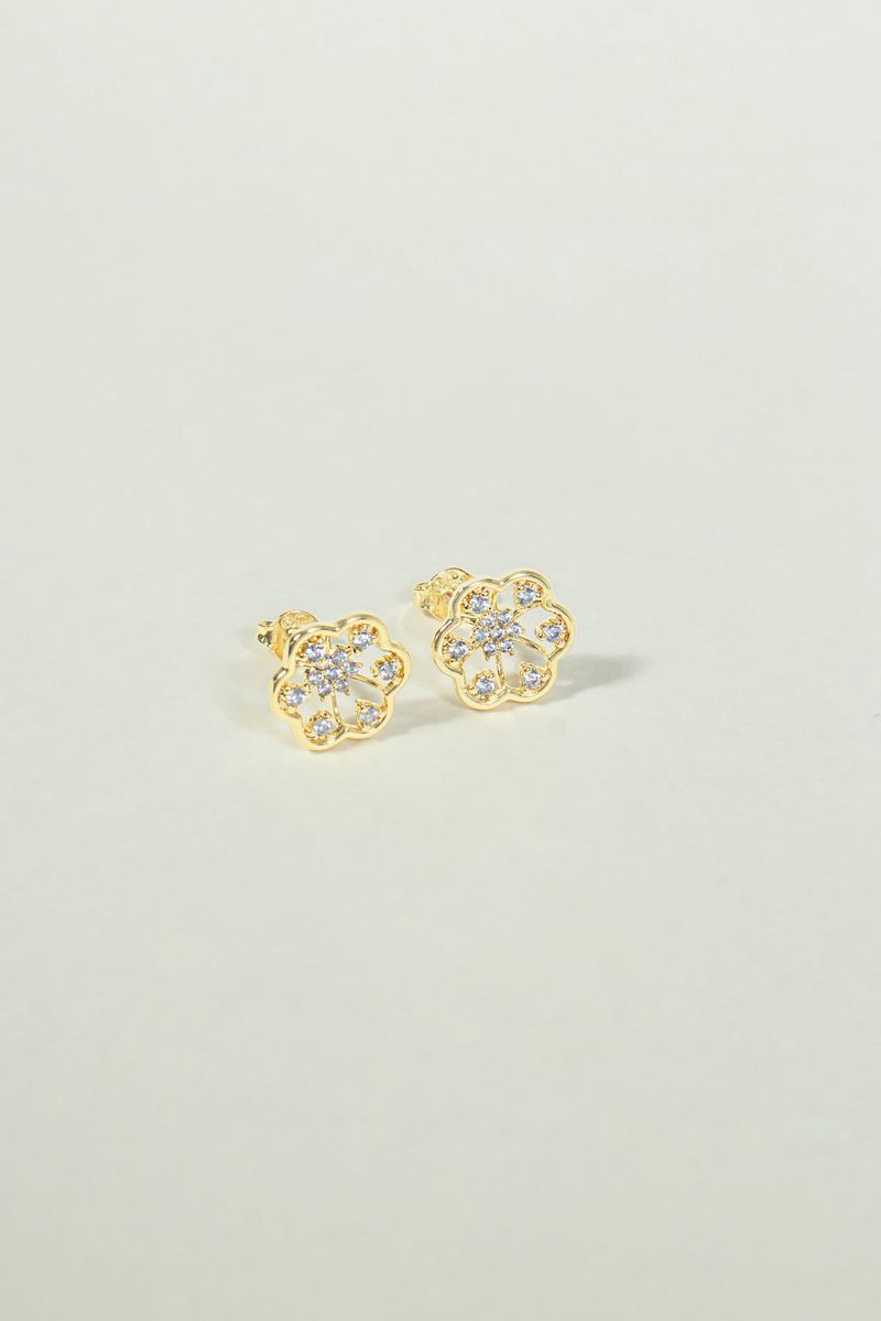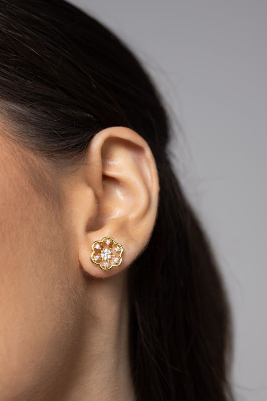Moderno e delicado, o Brinco Flor Vazada com Zircônias apresenta um design em formato de flor com detalhes vazados que trazem leveza à peça. As zircônias adicionam brilho sutil, destacando o contorno da flor com elegância.