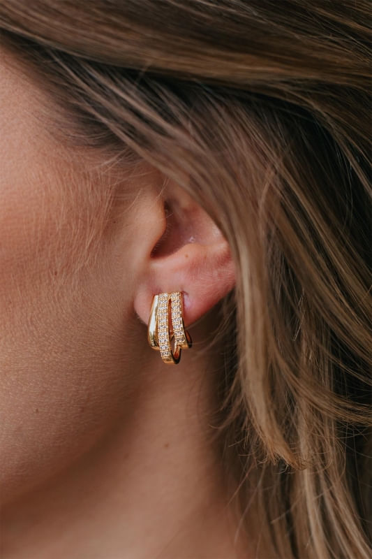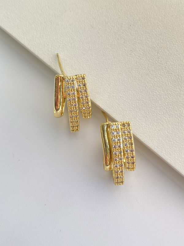 Brinco Meia Argola 3 Fios Lisa E Cravejada Banhada a Ouro 18k