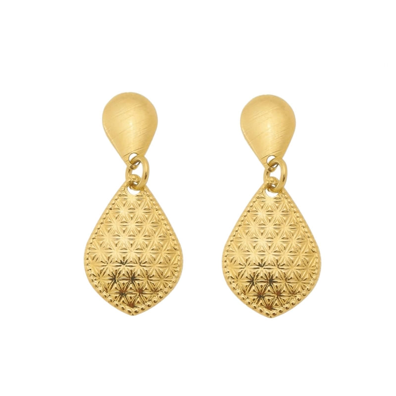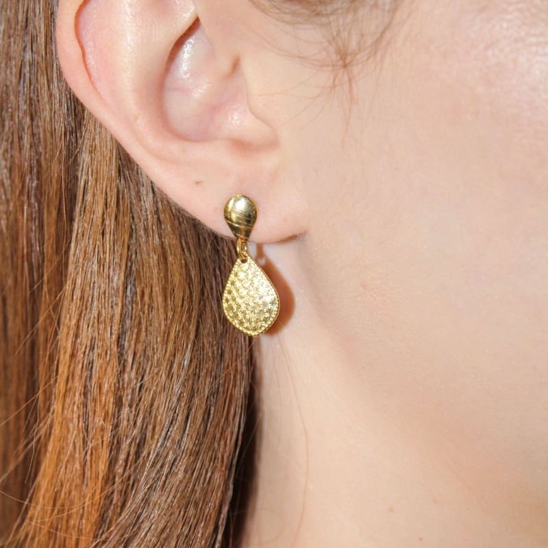 Brinco tipo pendurado com Gota Estampada Banhado em Ouro 18k.