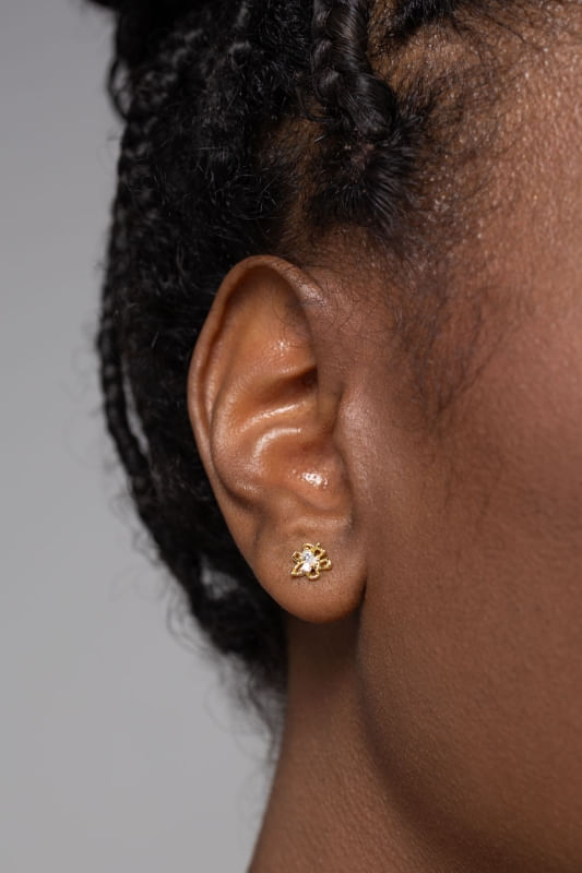 Com um design moderno e delicado, o Brinco Pequeno Flor com Zircônias apresenta o contorno de uma flor assimétrica e vazada, trazendo leveza e um visual contemporâneo à peça. No centro, uma zircônia adiciona brilho sutil, destacando ainda mais o formato elegante do brinco.