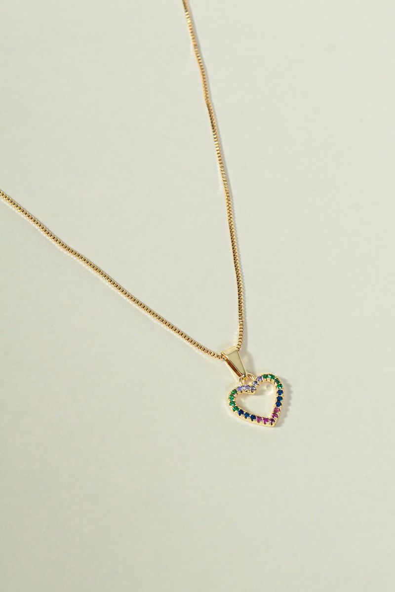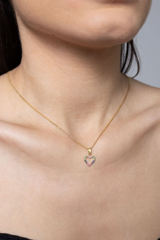 Contemporâneo e versátil, o Colar Coração Vazado Cravejado Colorido traz um design leve com presença equilibrada. O pingente em formato de coração, com estrutura vazada e detalhes em zircônias coloridas, adiciona um ponto de destaque sutil à composição.