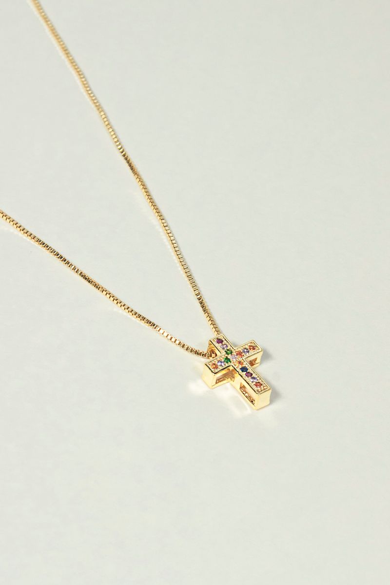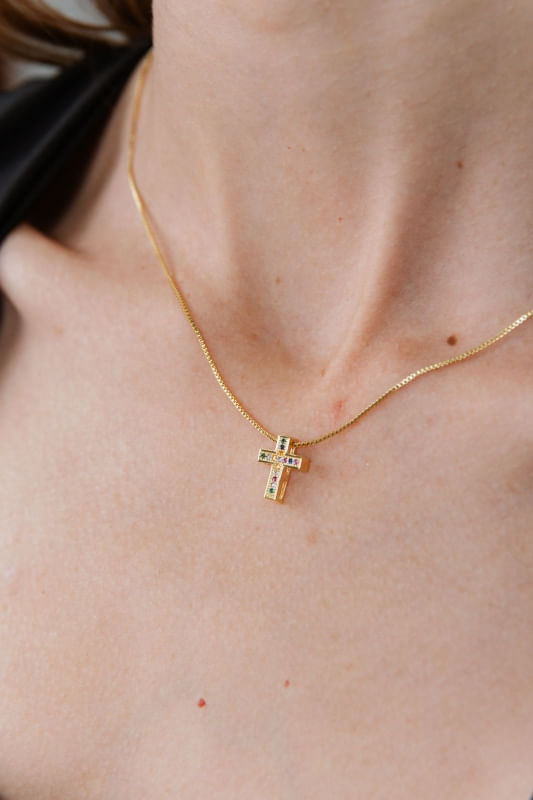 Colar Cruz Cravejado Pedras Coloridas