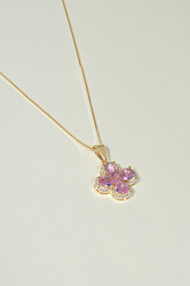 Colar Flor com Pedras Rosa e Cravejado