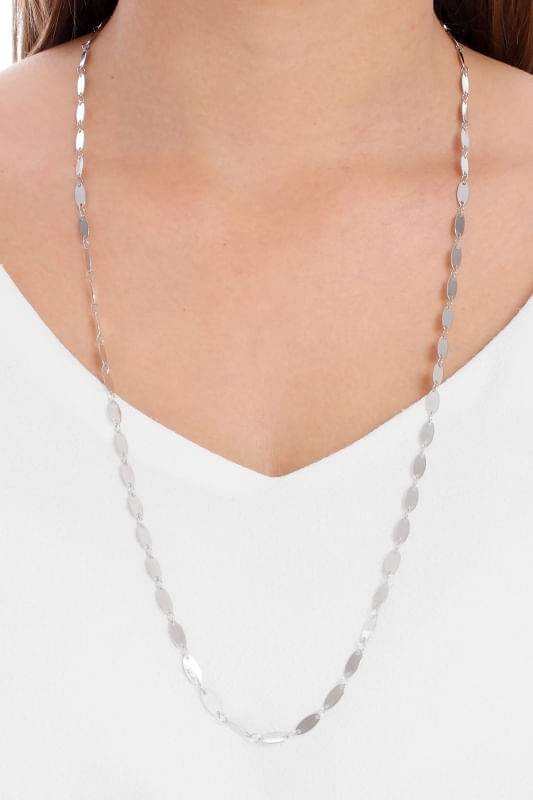 Este Colar 70 cm Plaquinhas Lisas é banhado em 10 camadas de Ródio Branco, garantindo a você muita qualidade e durabilidade, evitando que a peça escureça, desbote ou descasque.