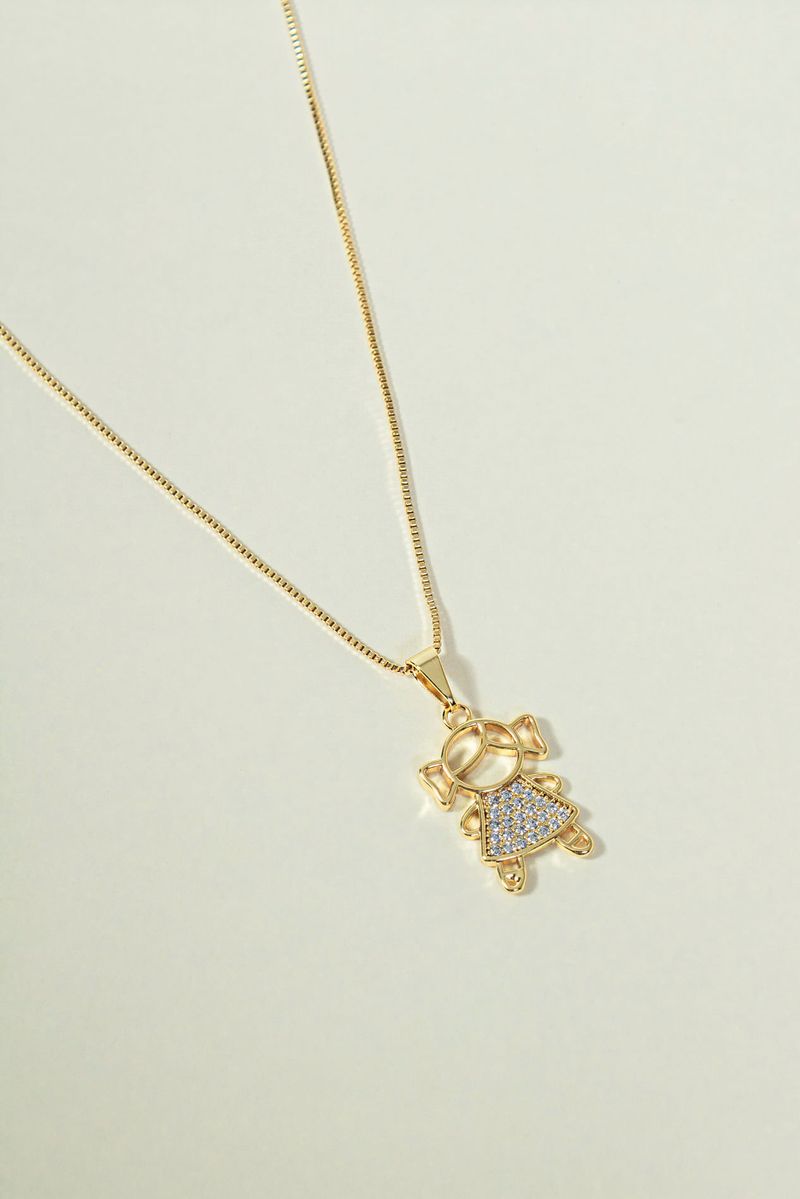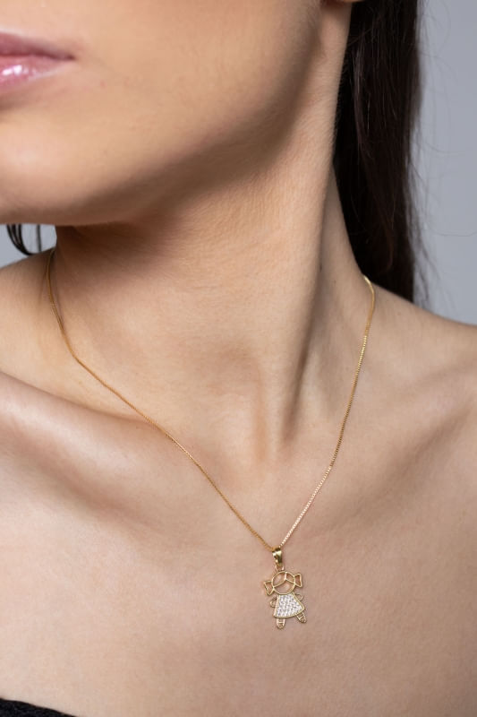 Com design delicado e simbólico, o Colar Menina Cravejado apresenta um pingente com detalhes cravejados em zircônias que valorizam o brilho da peça, criando um efeito visual elegante e sofisticado. O acabamento cuidadoso destaca a silhueta do pingente, trazendo charme e leveza ao acessório.