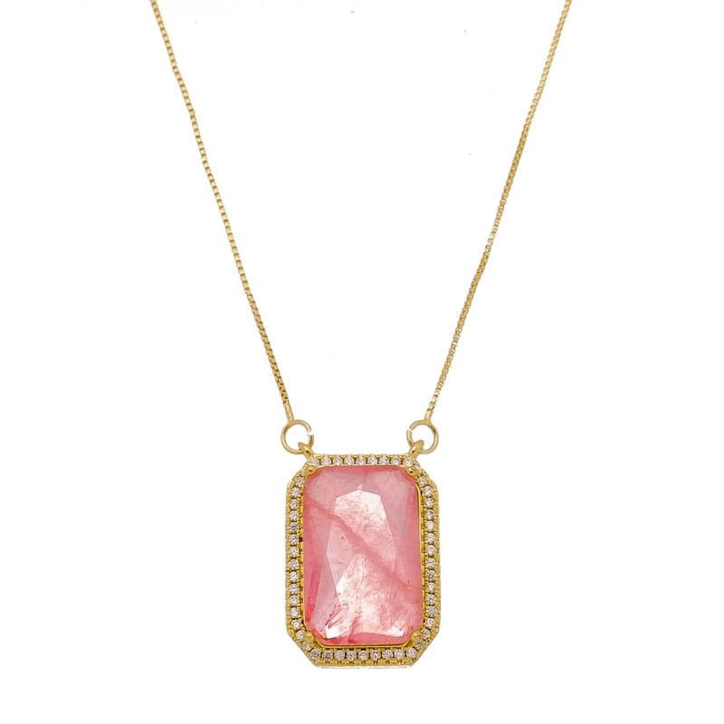 Com visual moderno e elegante, o Colar Pedra Rosa Fusion e Micro Zircônias apresenta um pingente retangular com pedra fusion rosa, contornado por micro zircônias que adicionam brilho delicado e sofisticado à peça. O contraste entre a tonalidade suave da pedra e o brilho das zircônias cria um acessório refinado e contemporâneo.