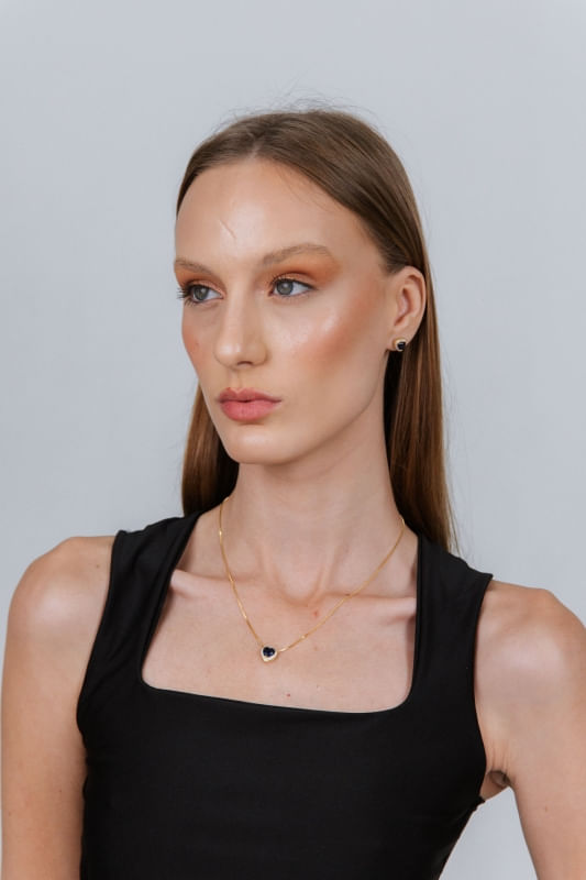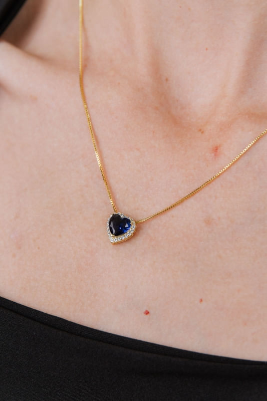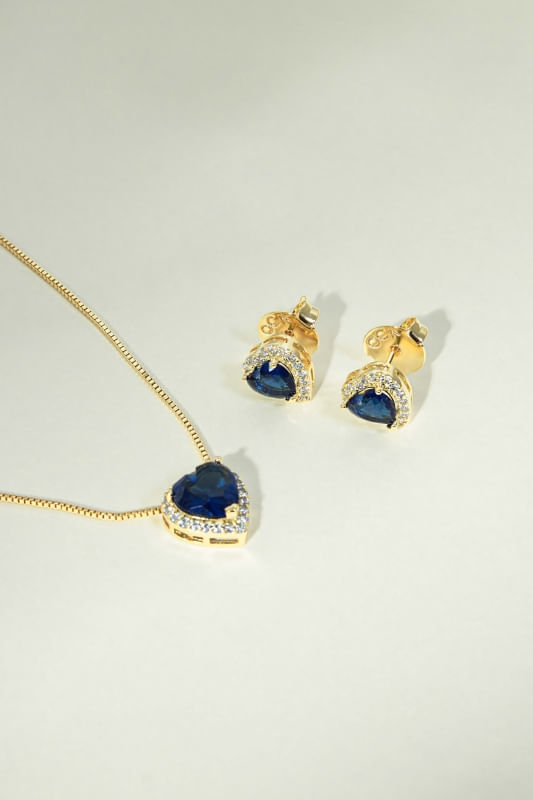 Conjunto Colar e Brinco Coração Azul Cravejado