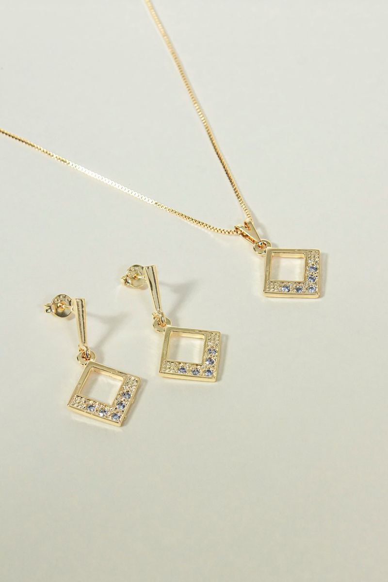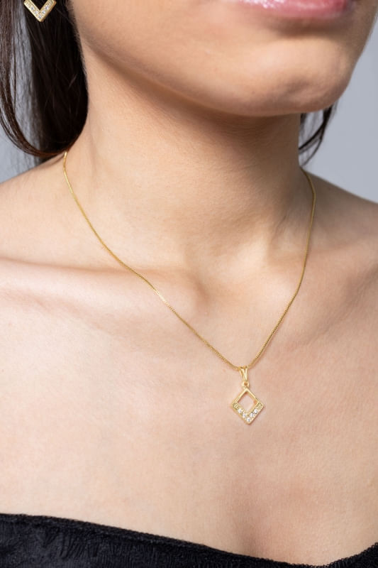 Este Conjunto Colar e Brinco Losango com Zircônias é banhado em 10 camadas de Ouro 18K, garantindo a você muita qualidade e durabilidade, evitando que a peça escureça, desbote ou descasque.