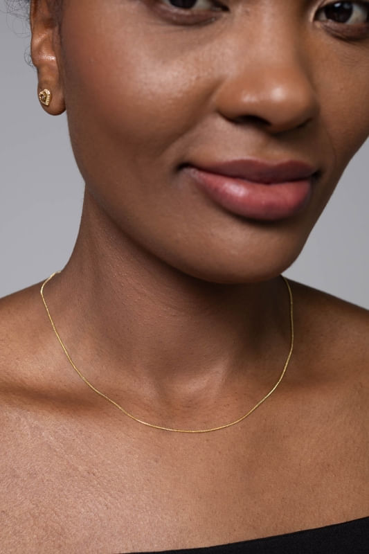 Com 45 cm de comprimento, possui ajuste confortável e posicionamento natural no colo, funcionando bem tanto sozinha quanto em composições em mix com outros colares.
