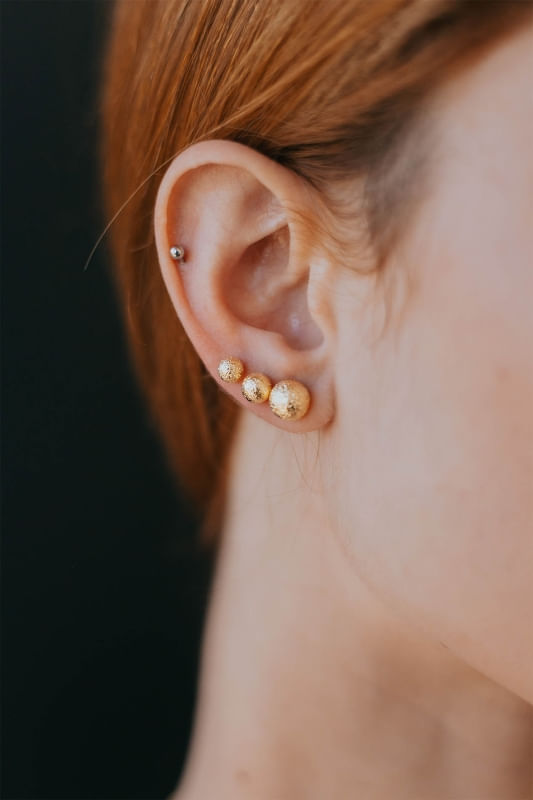 Este Trio de Brincos de Bola Craquelada é banhado em 10 camadas de Ouro 18k, garantindo a você muita qualidade e durabilidade, evitando que a peça escureça, desbote ou descasque.
